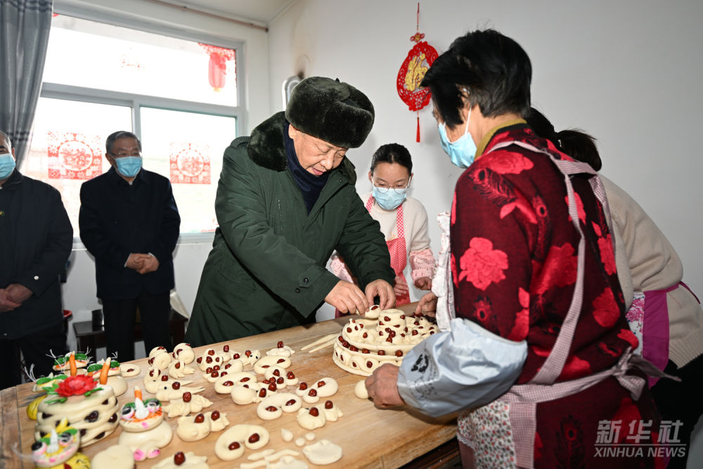 2022年1月26日下午,习近平在临汾市霍州市师庄乡冯南垣村,同师红兵一家做年馍。