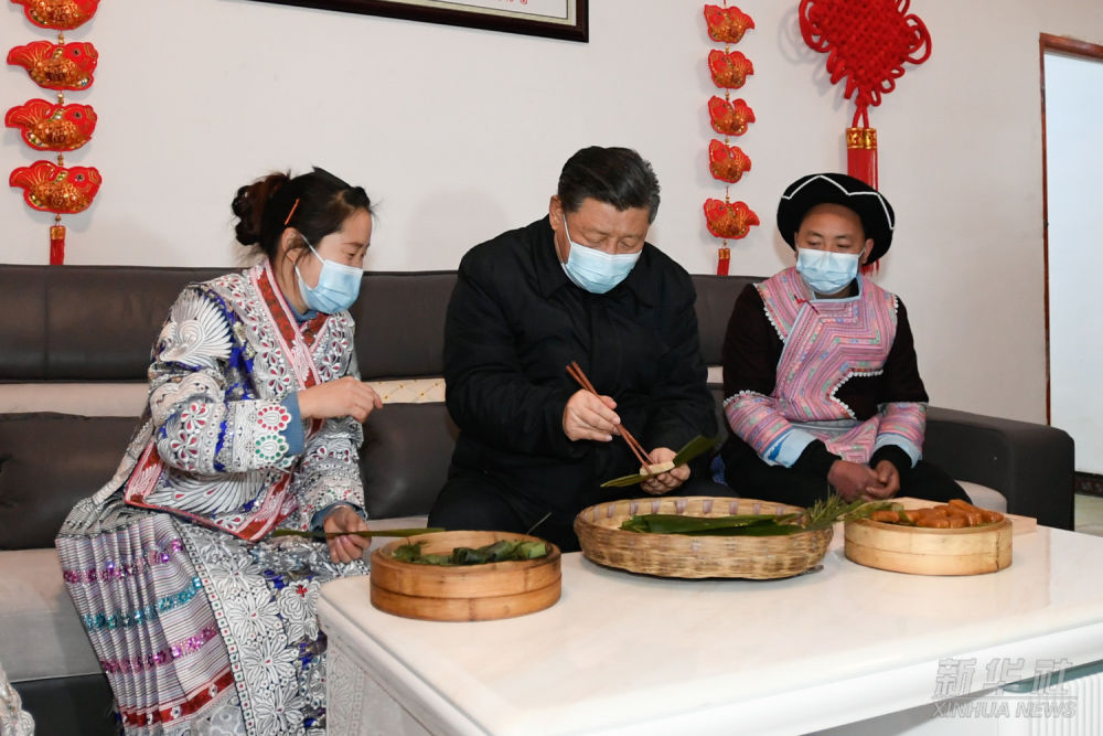 2021年2月3日至5日,习近平来到贵州考察调研,看望慰问各族干部群众,向全国各族人民致以美好的新春祝福。这是3日下午,习近平在毕节市黔西县新仁苗族乡化屋村苗族村民赵玉学家,同赵玉学一家边聊家常边制作当地传统节日食品黄粑。