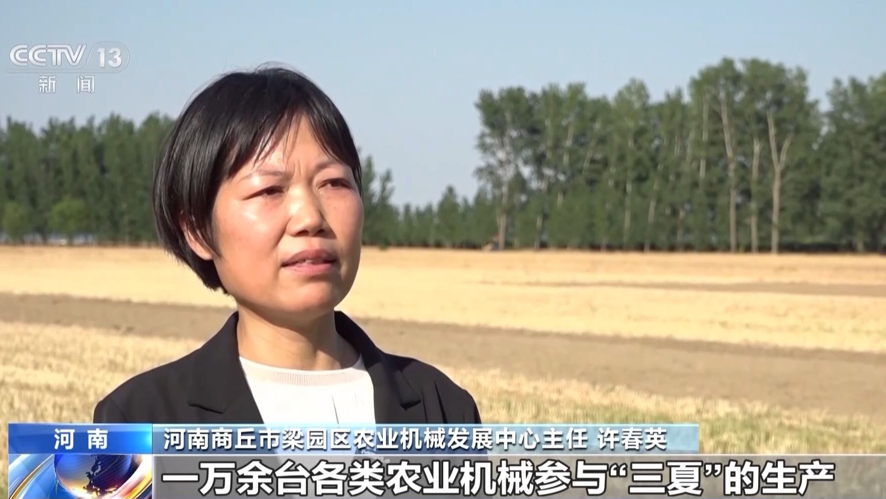 河南商丘市梁园区农业机械发展中心主任许春英:1万余台各类农业机械参与“三夏”的生产,确保农机的收割率达到99%以上,机播率达到98%以上。