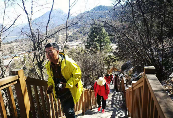 图为游客前往巴松措结巴村观景台。