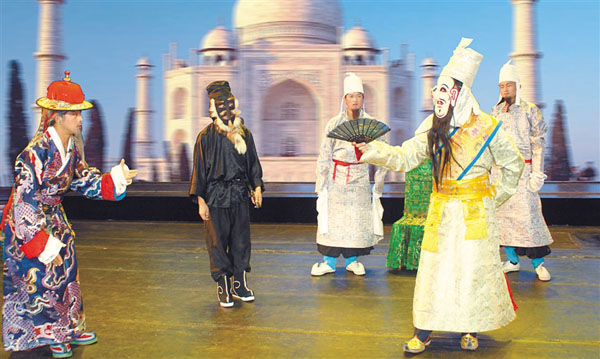 图为城关区娘热乡民间艺术团在表演蓝面具藏戏之《朗萨雯蚌》。