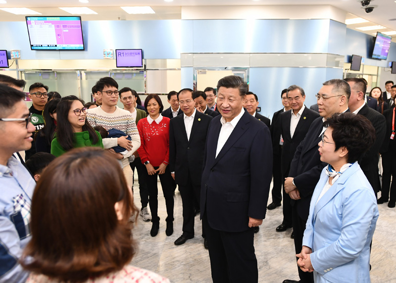 12月19日,国家主席习近平在澳门特别行政区行政长官崔世安陪同下,来到位于澳门黑沙环的政府综合服务中心和濠江中学附属英才学校,同澳门市民和师生亲切交流。这是习近平在黑沙环政府综合服务中心同澳门市民亲切交流。