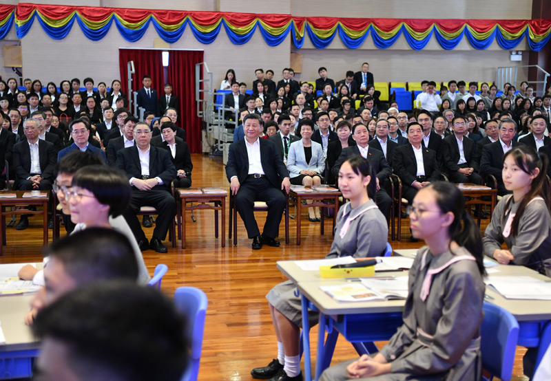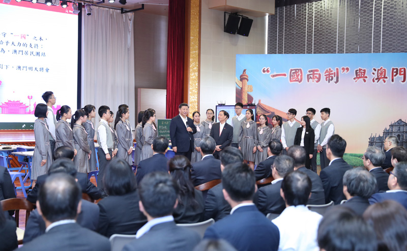 12月19日,国家主席习近平在澳门特别行政区行政长官崔世安陪同下,来到位于澳门黑沙环的政府综合服务中心和濠江中学附属英才学校,同澳门市民和师生亲切交流。在濠江中学附属英才学校观摩以“‘一国两制’与澳门”为题的中国历史公开课后,习近平走到学生中间即席发表重要讲话。